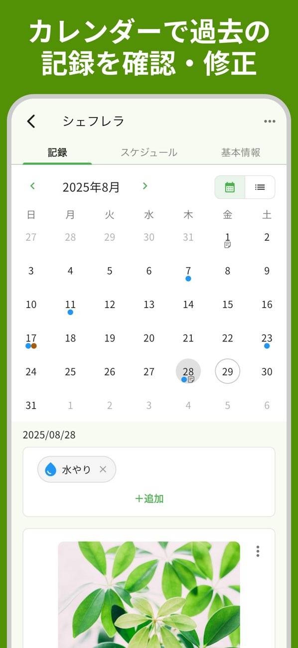 標準の水やりだけでなく、葉水・肥料・剪定など、お手入れの種類を自由に追加・編集可能。珍しい植物や特殊な環境で育てている植物にも対応できる柔軟さが魅力です。予定日以外の記録もできるため、土の状態を見て臨機応変に水やりした場合も記録に残せます。