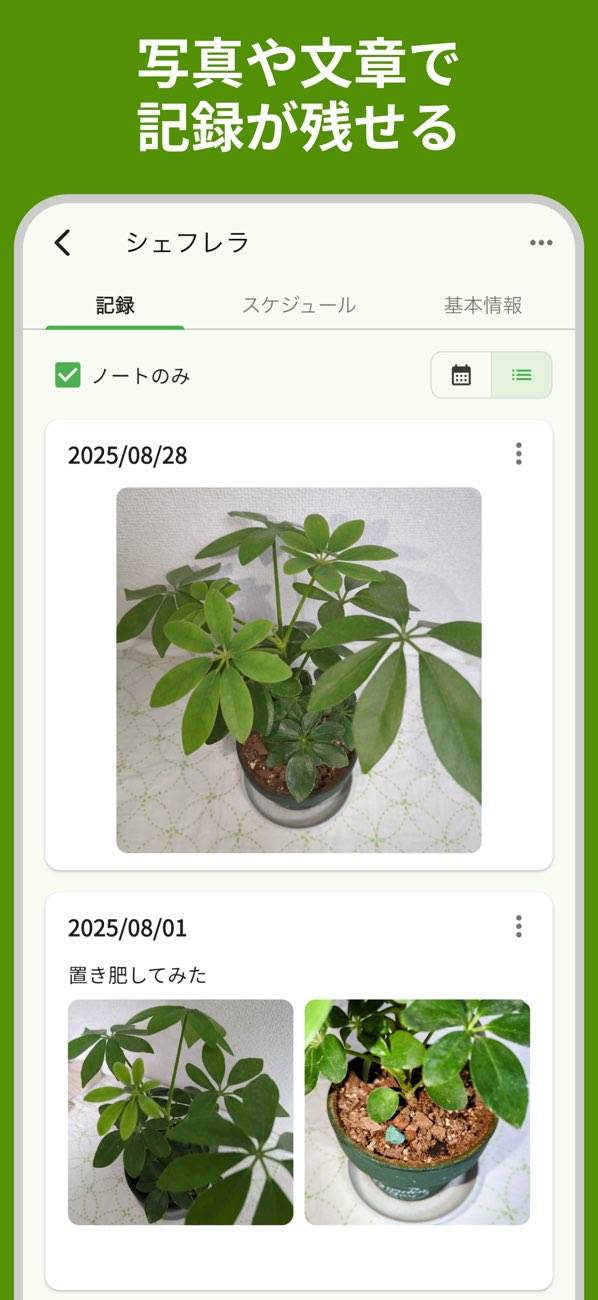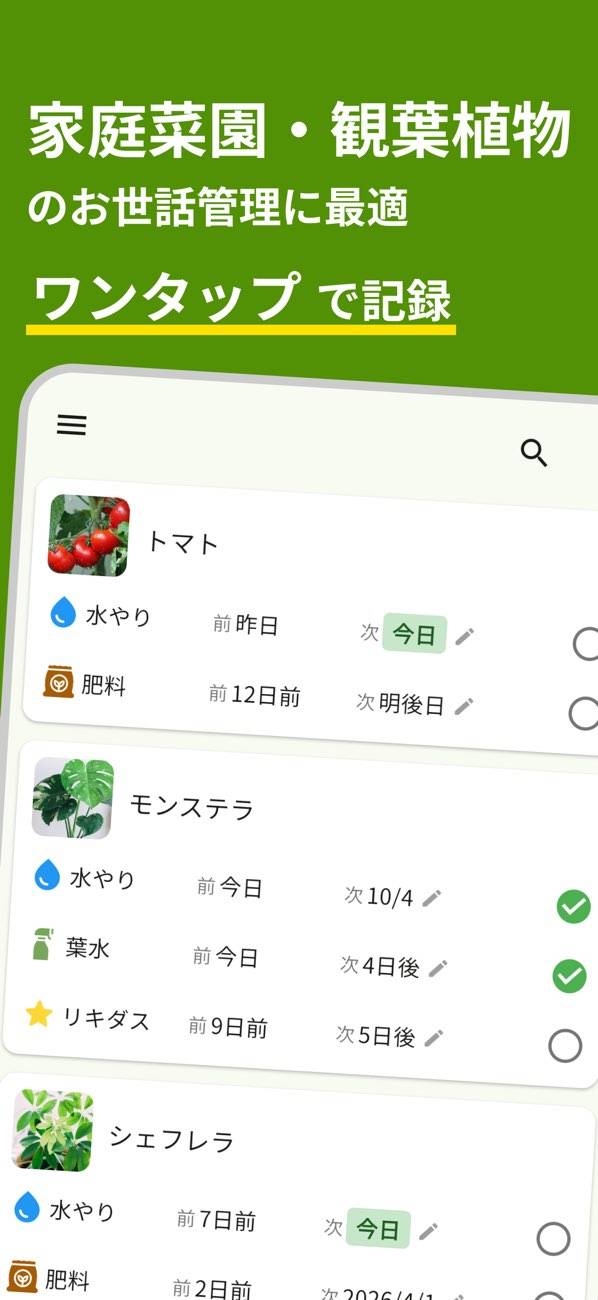 チェックを入れるだけでお手入れ完了。記録と同時に次回の予定日が自動で計算、表示されます。予定日になれば通知で知らせてくれるので、うっかり忘れの心配もなし。「いつやったか」「次はいつか」がひと目でわかり、忙しい日常でも植物のケアができます。