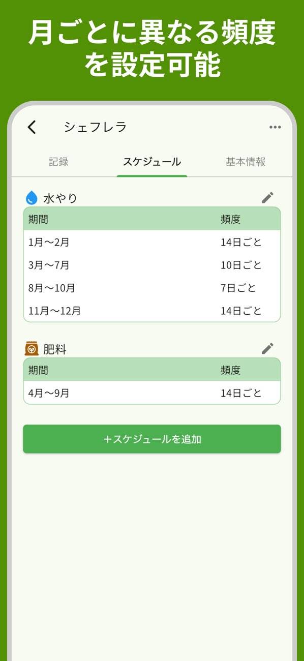- 月ごとに頻度設定できるから、季節に応じた適切なケアが可能に