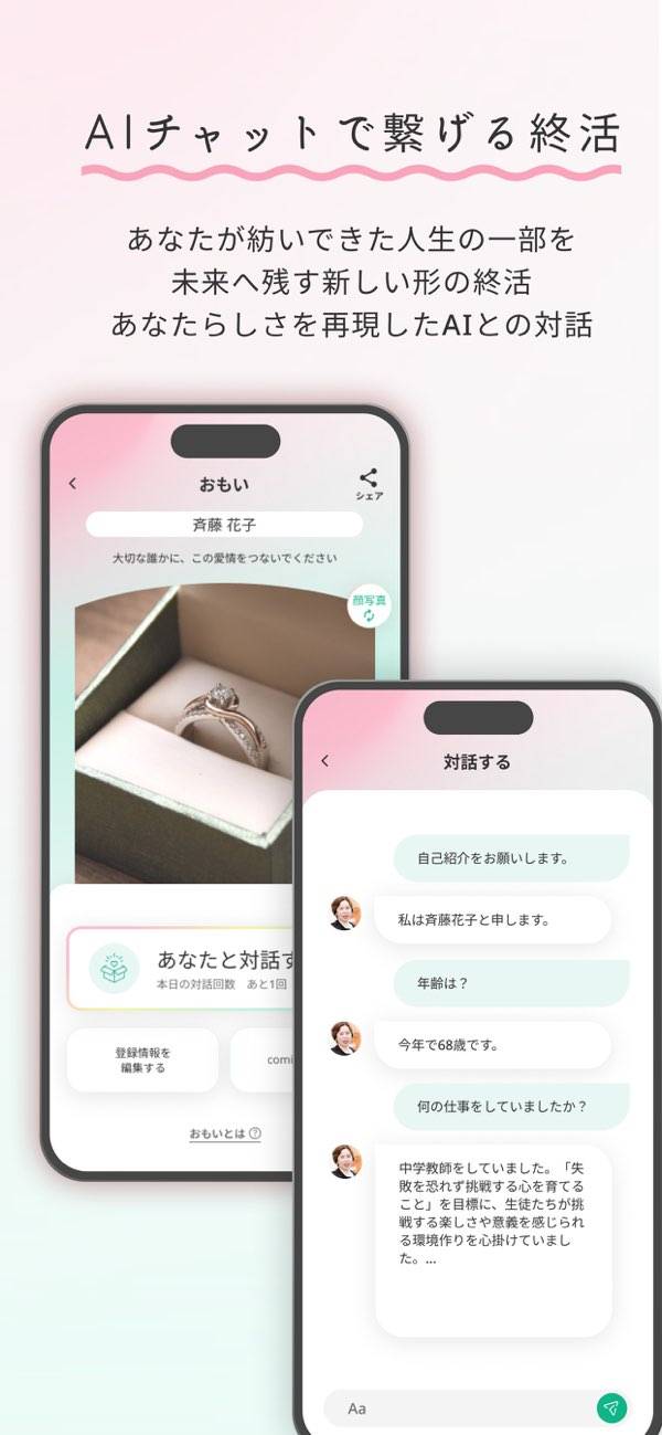 「おもい」という終活関連機能では、毎日1回、自分を模したAIと対話できます。対話を続けることで、自分自身の人生を振り返り感じたことを整理可能。AIも対話内容を学習し、あなたの考えや思いを記録・シェアできます。