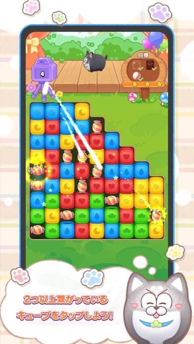 連なった同色のブロックをタップで消していくシンプルなパズル。指定された色のブロックを一定数消すなど、条件を達成して各ステージをクリアしていきましょう。1回で5個以上のブロックを消すとキャンディが出現し、一気にブロックを消す爽快感を楽しめます。