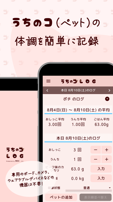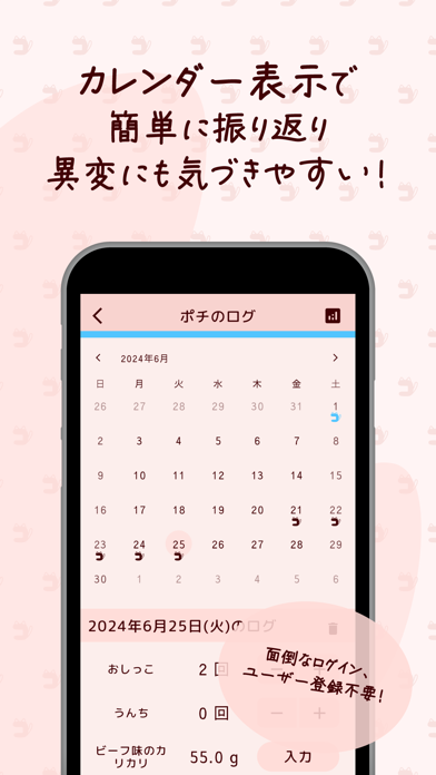 - 食事・排泄・体重を簡単入力。タップと数値入力だけで続けやすい