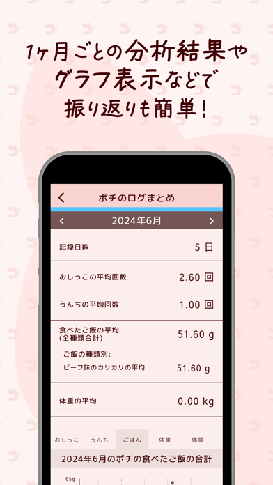 毎日の健康状態をカレンダー表示やグラフですぐに確認可能。日々の振り返りに加え、動物病院での診断時に役立ちます。「食欲が減ったのはいつ?」「どのくらい体重が増えた?」という獣医さんの質問に答えられるため、より適切な診断と治療につながりますよ。