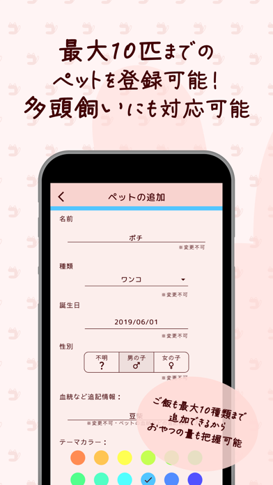 - 最大10匹まで複数ペット管理が可能。色分けで入力ミスも防止