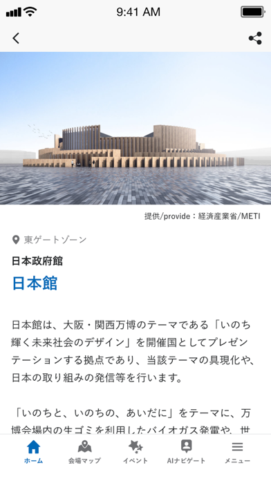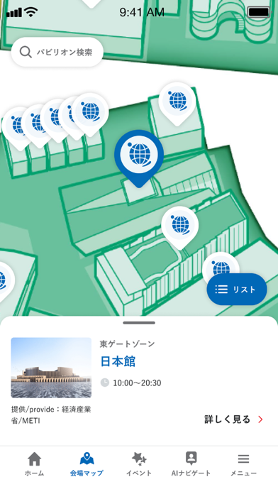 来場前の準備から当日の案内まで一貫してサポートしてくれます。出展国や興味のあるテーマでパビリオンを検索し、見学したい展示をブックマーク。気になるイベントの日時やチケット予約情報も事前にチェックしておけば、限られた滞在時間を無駄なく使えます。
