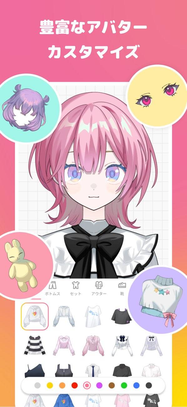 髪型や目、口などを選び、自分好みのアバターを作れます。色のパターンも豊富で、モノトーン系からカラフルまで幅広く対応。イラストを外注する必要がないので、コストゼロで個性を出したVTuber活動をスタートできます。