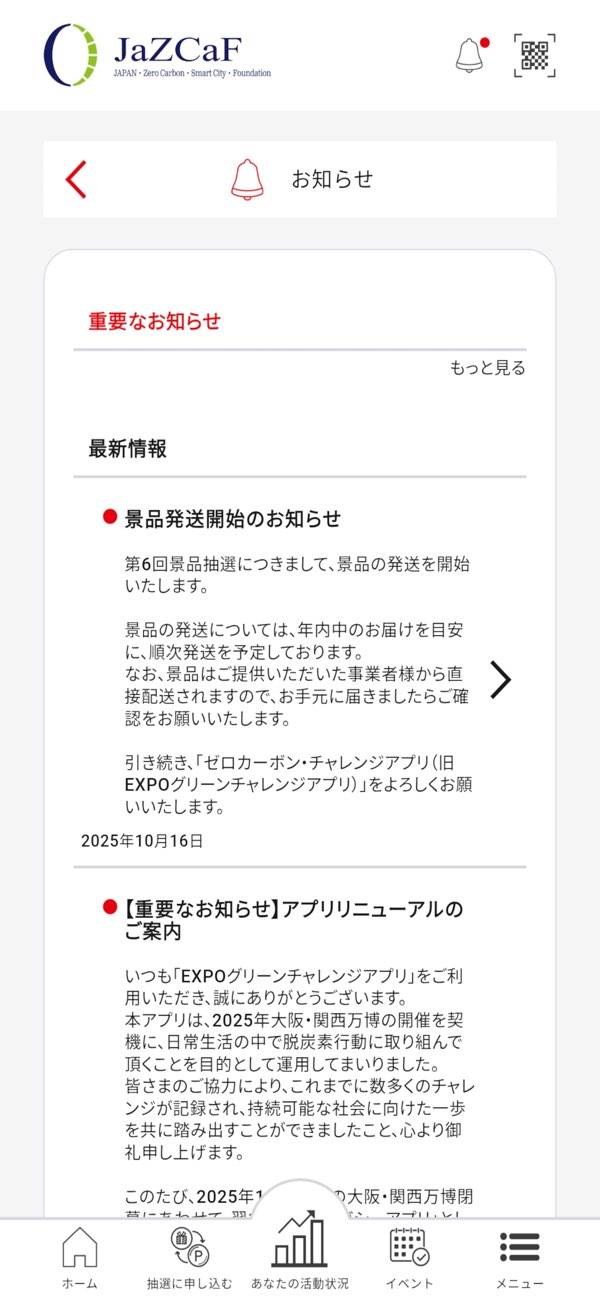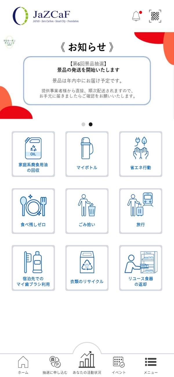 大阪・関西万博を機に環境問題へ意識を向け、エコな生活に取り組むためのアプリ。ゴミ拾いや衣類のリサイクルを達成した際、アプリからその活動を記録すると、ポイントを獲得できます。貯めたポイントは抽選への応募に使用でき、日用品をゲットできるチャンス。環境に配慮しつつ、生活面でもメリットを感じられます。