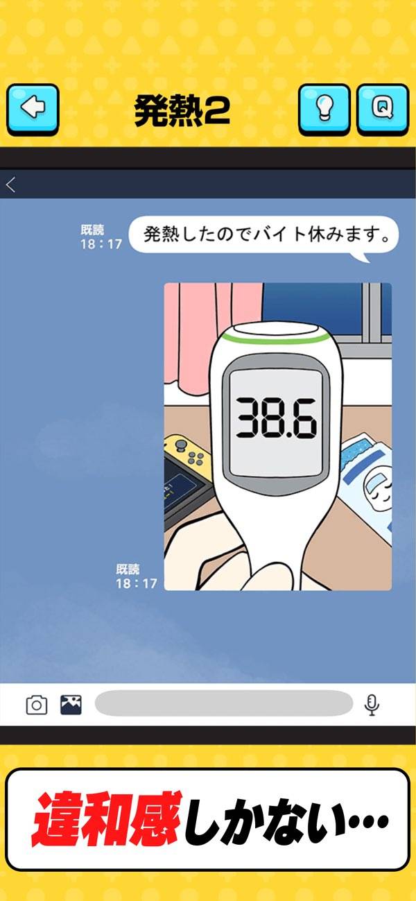 日常のあるあるがテーマの推理ゲームです。「電車遅延してて遅れます」のメッセージと共に添付された1枚の写真。パッと見は確かに問題ないように見えますが実は……。