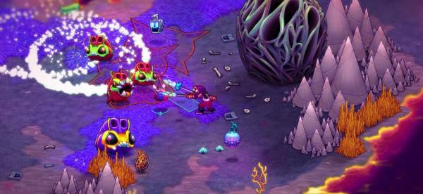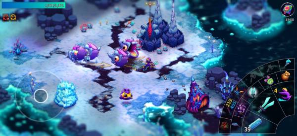 惑星を歩き回って素材集めが第一の基本。植物や敵キャラがそこら中に存在しているため、刈り取りながら素材を集めていきましょう。スマホでも特に支障なく遊べる操作感。アメコミ風のオーバーなアクションもあり、ただの素材集めも爽快に楽しめる出来となっています。