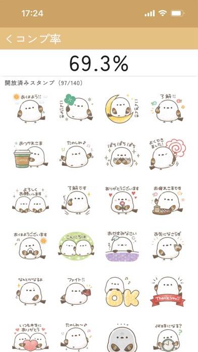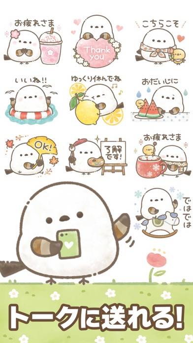 「もちっと!シマエナガさん。」のスタンプが140種類収録。収録されているスタンプは、ファイトやこんにちはなど、シンプルでかわいいものが多く、日常会話で使いやすいです。使い方も簡単で、スタンプを選び、共有画面からSNSの送り先を選択するだけ。