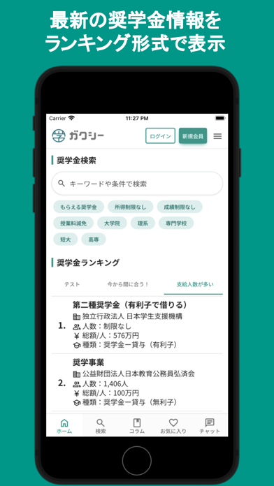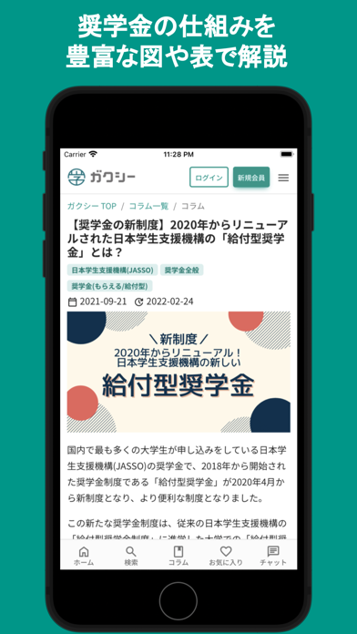 1万件以上の奨学金情報が掲載されているアプリです。返済義務のない給付型奨学金も大きく紹介されており、自分の条件に合う給付型奨学金が見つかる可能性も十分にあります。検索やコラムなどその他の機能も充実。