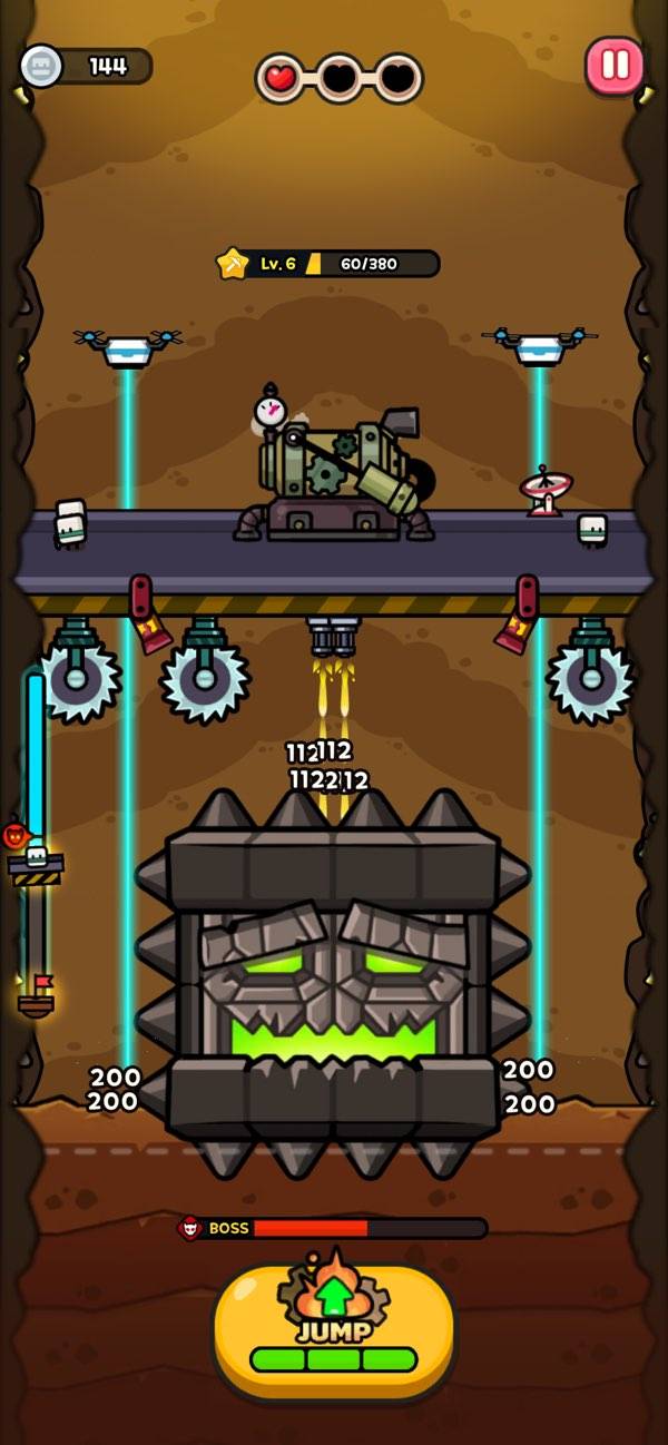 自動進行をベースに、軽いアクションが加わったゲーム性。メカは自動で下降しながら地面を破壊し進んでいくのですが、破壊が間に合わない場合は足場をジャンプさせる必要があります。単なる放置に留まらない、自力で攻略していく手応えが確かに存在します。
