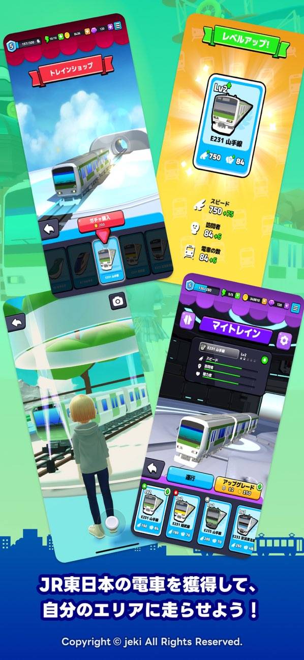 ステーションの発展も本作の大事な要素の一つ。ステーションでは山手線や総武線など実在車両の購入やアップグレードを行っていきます。トレインのレベルアップ時には、新たな車両が連結されるアニメーションが挿入されるという凝った演出も。