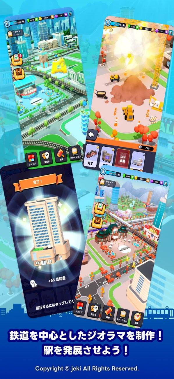 自分だけのトレインタウンを発展させていくデジタル鉄道ジオラマゲームです。プレイ感は経営シミュレーションに近く、建物の建設やステーションのアップグレードを通じ、タウンの訪問者を増やしていきます。