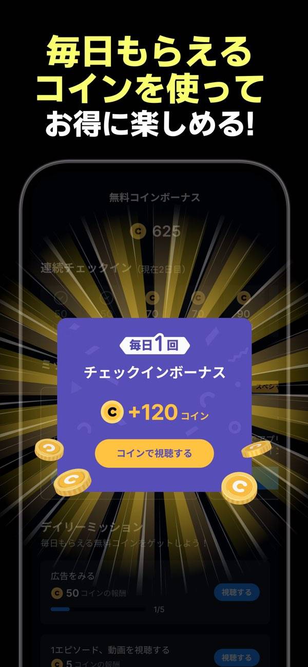 お財布的にも優しいシステム。おおよそ8話以降では、視聴の際に有料アイテムのコインが必要になりますが、コインはアプリ内のミッションをこなすことでも獲得可能です。全部こなせば1日あたり4~5話分のコインになり、十分現実的に最終話まで無料で視聴できるのです。
