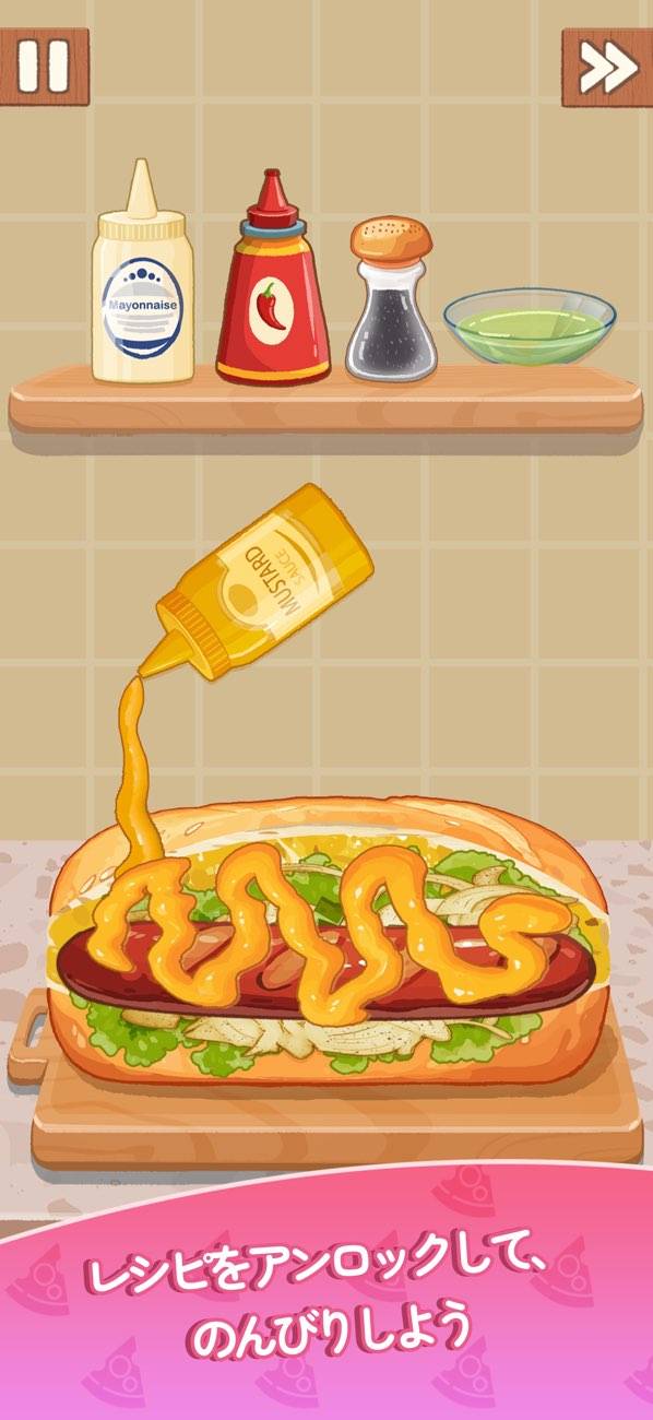 各料理ごとに、工程が細かく再現されている点も特徴的。ホットドッグでは材料を刻み、下地となるソースも作る工程もあります。塩やマヨネーズといった調味料を順番に混ぜ合わせ、特製ソースを作っていきます。一体どんな味がするのか、実際に作ってみたくなる魅力があります。