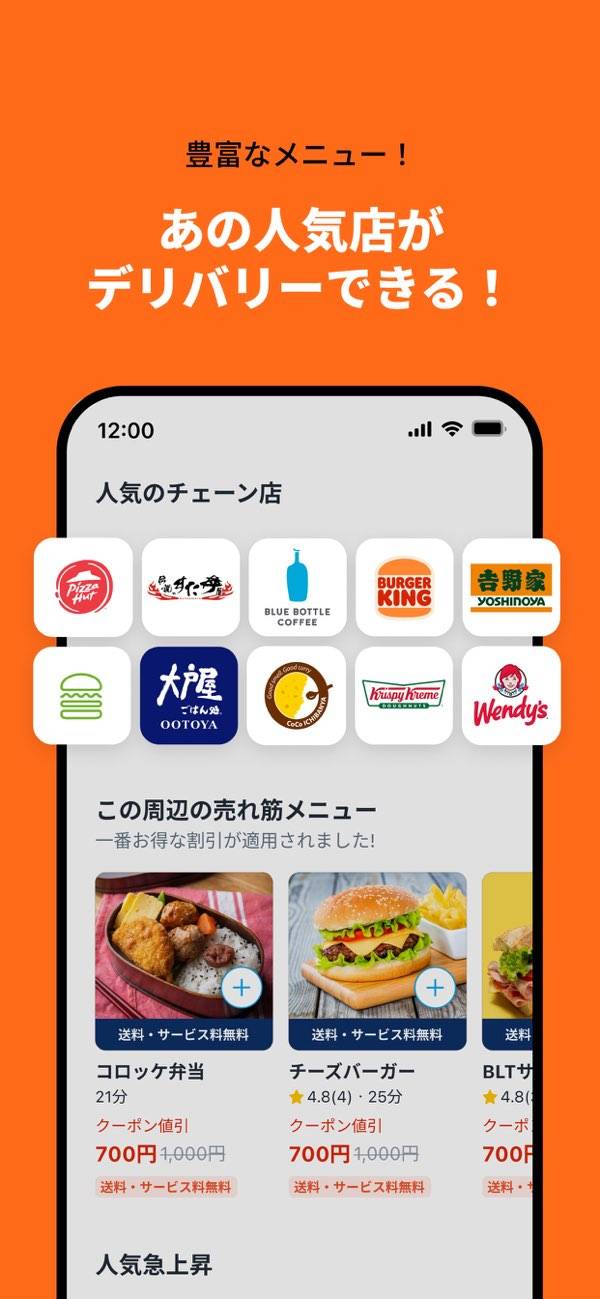 豊富な種類の飲食店から、好きな商品を選んで注文できます。シェイクシャックやもうやんカレーなどの飲食店からデリバリー注文が可能。新規ユーザーなら総額4,000円分の初回限定クーポンも用意されており、お得にサービスを試せます。