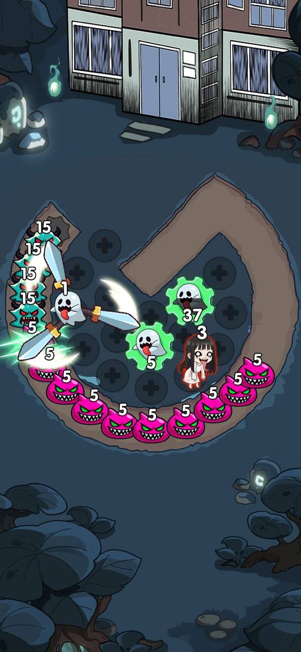 ヒーローの召喚と合成がバトルの基本。銀貨でヒーローを召喚、ステージを周回する感染者を倒し、銀貨を獲得していく流れ。ヒーローの攻撃範囲を意識した配置も重要です。また、同じモンスターが3体集まると合成が可能になり、戦闘能力が大幅にアップします。