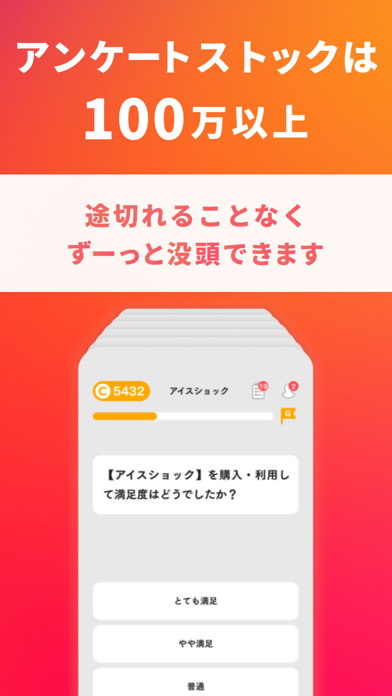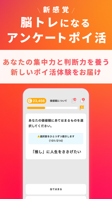 誰でも簡単に回答できるアンケートが毎日届きます。「長い質問文を読むのが面倒」「選択肢が多すぎて迷う」など、アンケートを回答する際の煩わしさがありません。また、回答はいつでも中断できるので、自分のペースで無理なく続けられます。