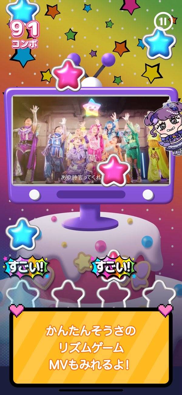 リズムゲームとしてしっかり遊べるクオリティ。落ちてくる星(ノーツ)をリズムに合わせてタップしていく定番システムです。タップ時に「シャン、シャン」というタンバリン風の効果音つき。また背景では楽曲ごとのMVが流れており、曲の雰囲気が二重に盛り上がっています。