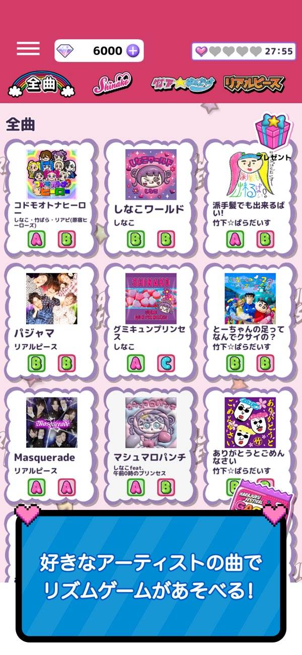 原宿系アーティストの楽曲で遊べるリズムゲームです。「しなこ」「竹下☆ぱらだいす」「リアルピース」が登場。完全無料でアプリ内課金はありません。