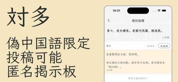 エセ中国語で交流しようというコンセプトのネタ系掲示板アプリです。本物の中国語は微塵も覚えていなくてOK。「今、我入浴」レベルの適当な感じの並びで構いません。