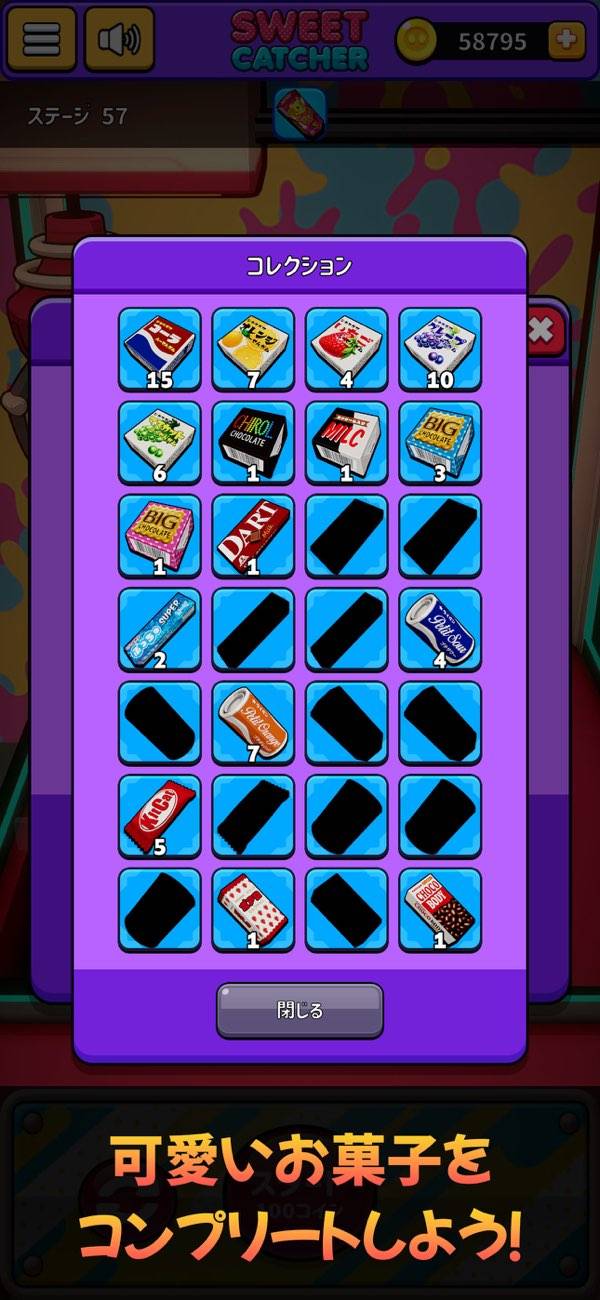 獲得したお菓子はコレクションとして登録されていきます。小さい箱のガムにコーララムネなど、こちらもまた実にわかっているバリエーション。画面が少しずつ埋まっていく様子に図らずも充実感が芽生えてきます。ああ、駄菓子を食べたくなってきました……。