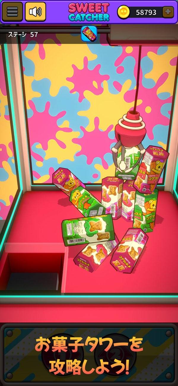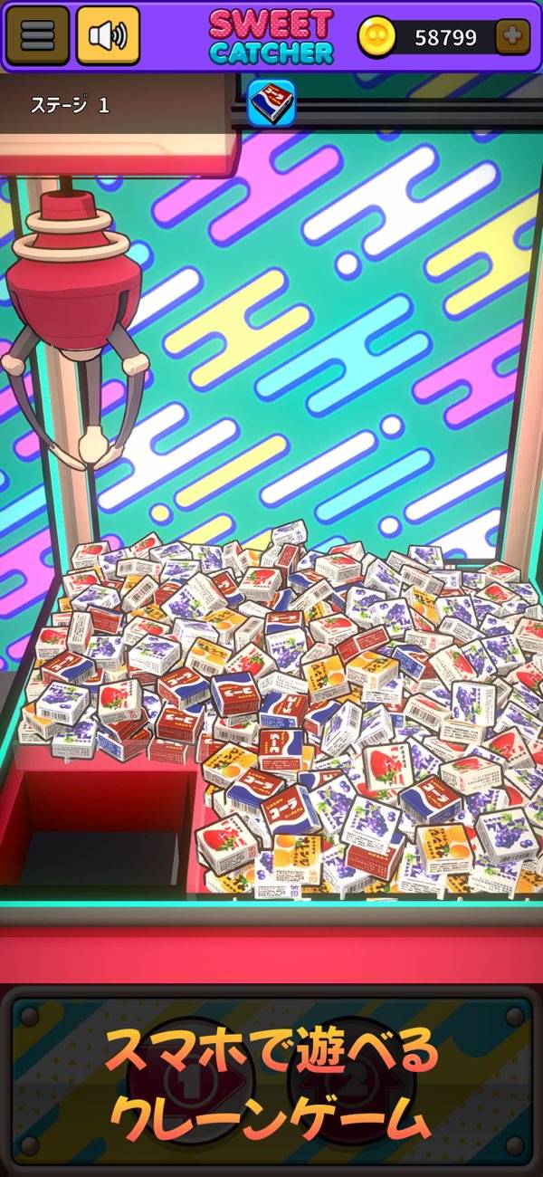 「クレーンゲームで遊んだ感」を手軽に補充できるゲームがこちら。重量感軽めの三本爪タイプのクレーンを巧みに操り、ステージごとに定められた目的のお菓子の景品の獲得を目指しましょう。