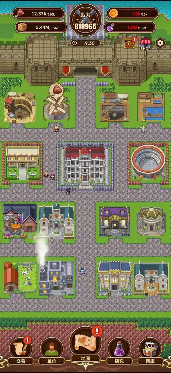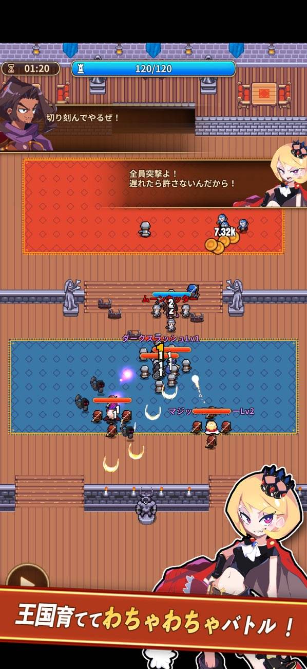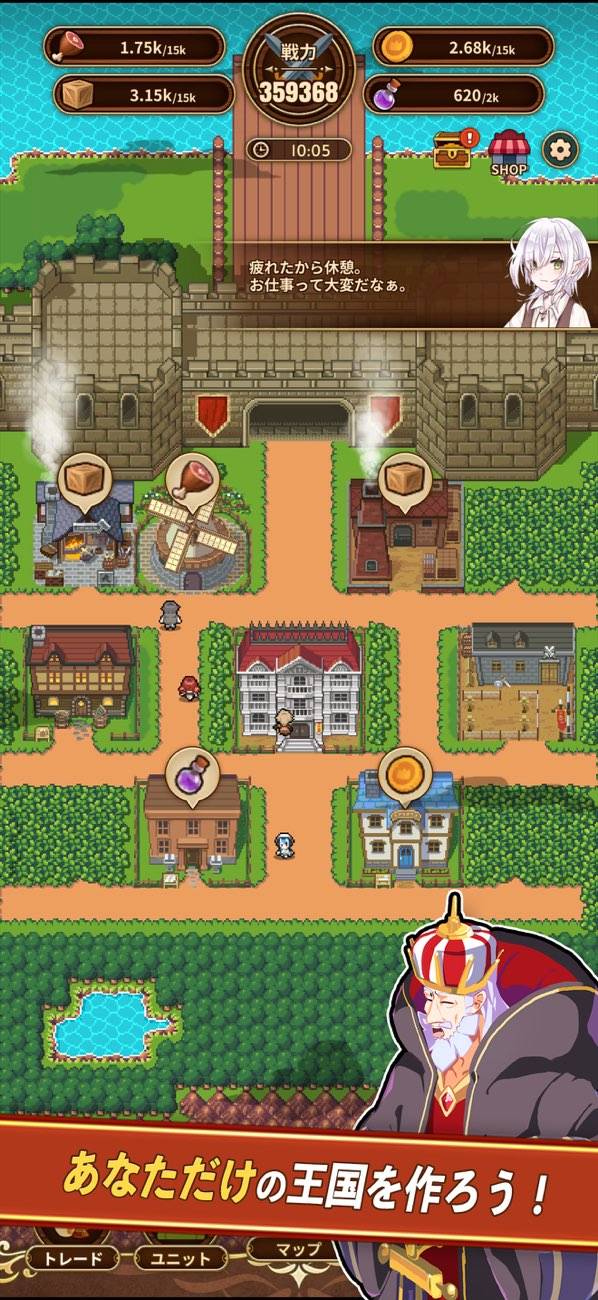 シンプルながらも成長の実感を確かに感じる国造りパート。初めはむしろ徹底抗戦どころか、どうやって国を維持できたか不思議なレベルの王国を、少しずつ発展させていきます。なお街の住人をタップする(せっつく)ことで生産性アップも可能となっています。