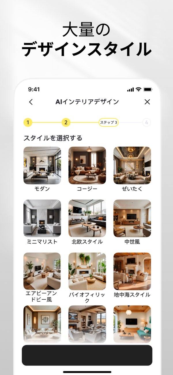 部屋全体のイメージであるスタイルを30種類から選択可能。モダン、ミニマリスト、北欧スタイル、地中海スタイル、アニメ風、ボヘミアン、禅など、世界各国のさまざまなスタイルが収録。自分好みのスタイルを選べば、すぐにAIが生成してくれます。