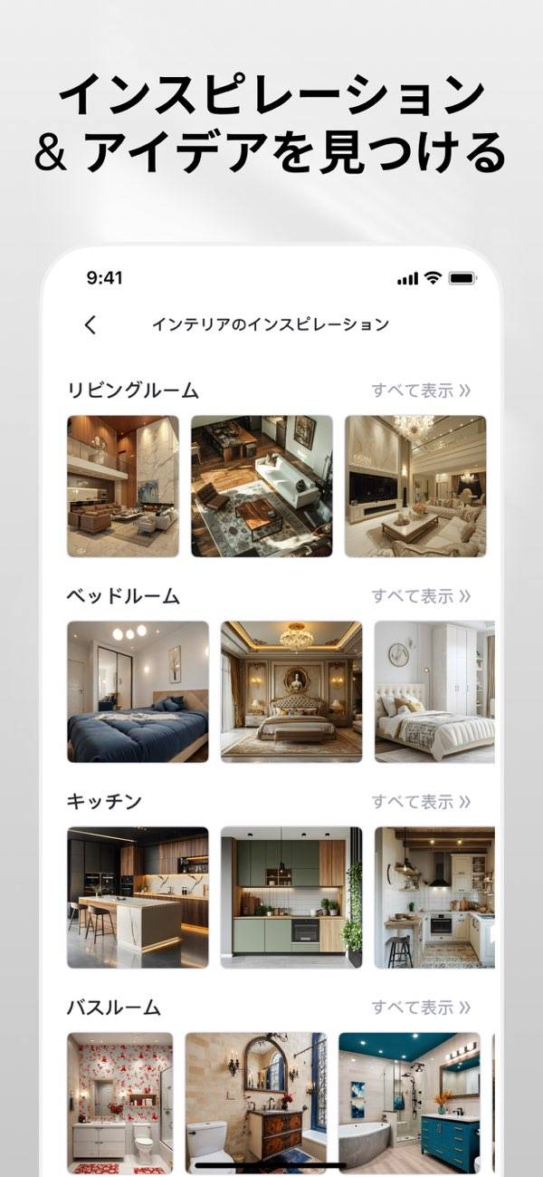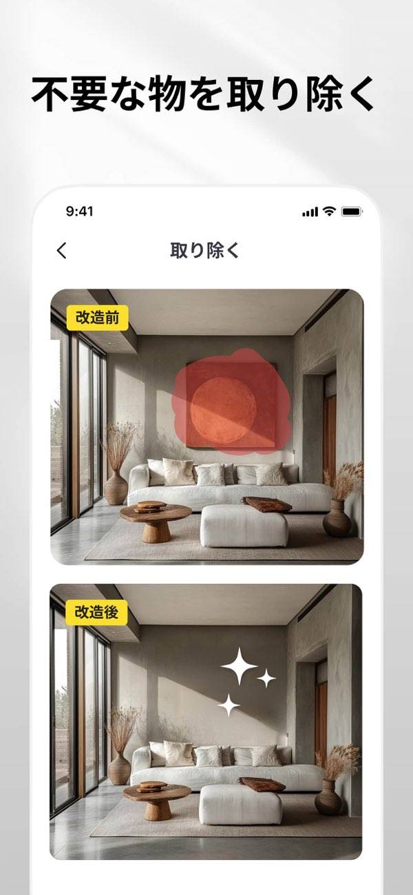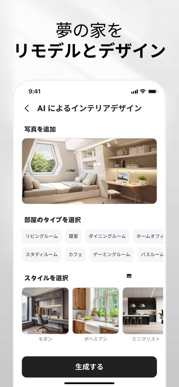 「どんな家具を置けばいい?」「レイアウトがうまく決まらない」……。そんな部屋の悩みを解決してくれるのがこのアプリです。部屋の写真を1枚撮るだけで、AIが最適な家具や配置を瞬時に提案。また、壁や床もAIに任せるとすぐに変更できます。本アプリを使えば、誰でも簡単に理想の部屋づくりを始められますよ。