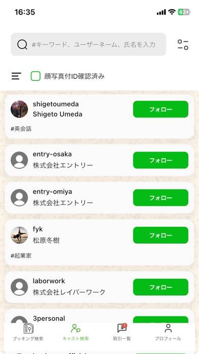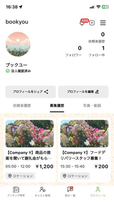 企業・個人問わず、さまざまなブッキング(依頼)が紹介されているプラットフォームです。ダンス体験レッスンに参加など、仕事以前の段階で報酬が発生するブッキングが多数掲載されている点が特徴的。利用者数などの点で、記事執筆時点ではまだ発展途上という印象ですが、可能性を感じるサービスです。