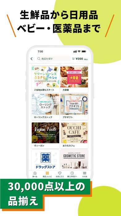 実店舗に行かず、自宅で買い物を済ませられるイオンのネットスーパーです。公式発表で30,000点以上という、実店舗をはるかにしのぐ商品数が表立った特徴の一つ。低価格が魅力のプライベートブランド「トップバリュ」製品も3,500点以上の品揃えです。配送時間も7時~23時まで幅広く対応。