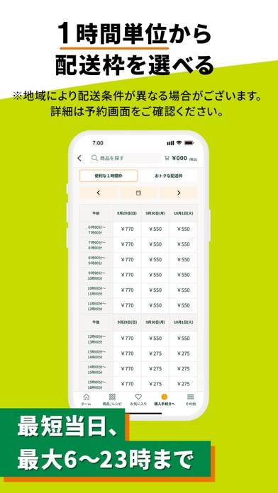 配送時間は7時~23時まで対応しており、比較的遅い時間でも受け取り可能です。配送時間帯の指定もでき、「2-5時間枠」であれば配送手数料は110円~330円と無理のない価格設定。もし税抜で12,000円以上の注文になれば配送手数料が無料になります。