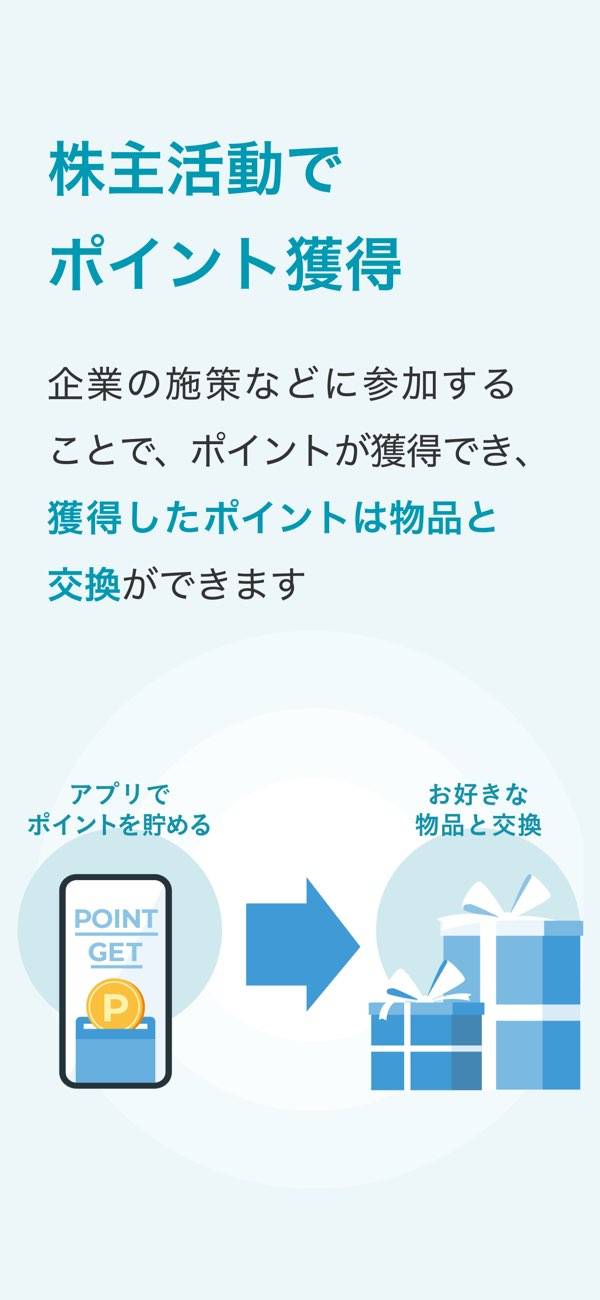 保有銘柄の配当金情報や企業からのお知らせをアプリ内で手早く確認でき、株主活動が円滑に。さらに株主活動を行うと独自のポイントが加算されるシステムが搭載されており、スイーツなどの物品と交換可能です。