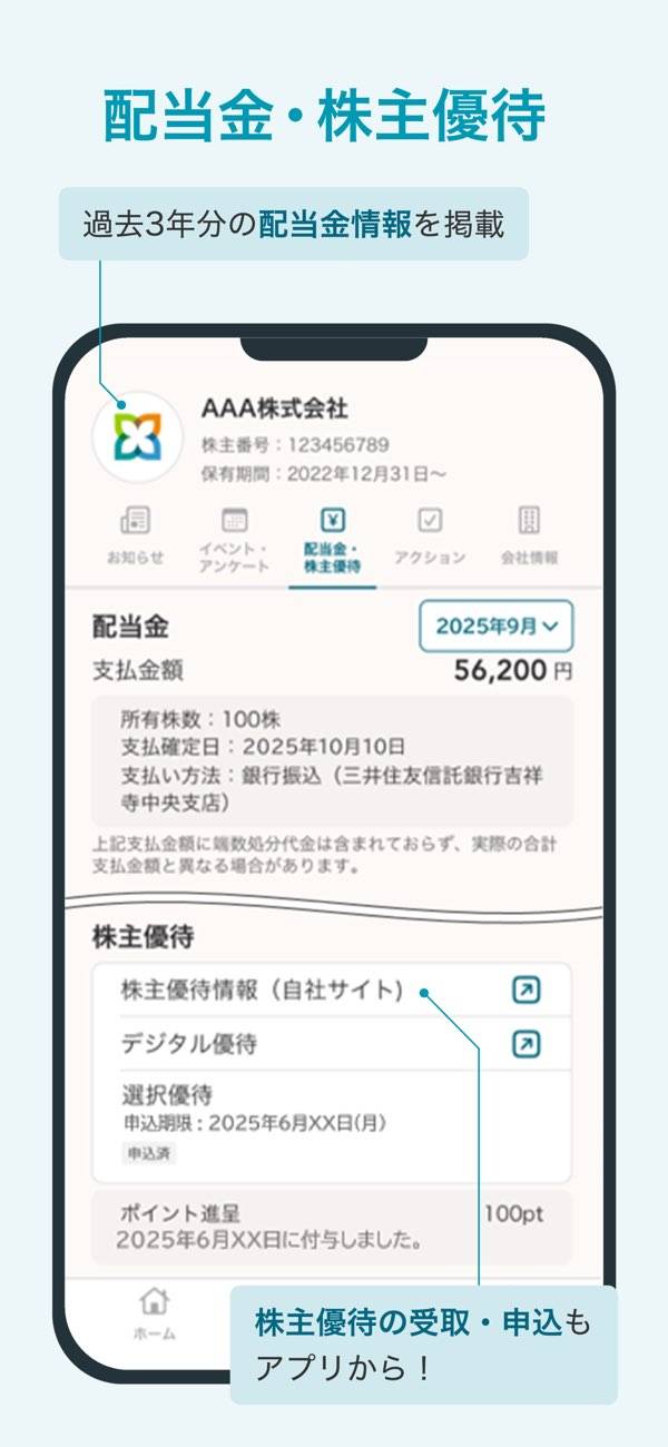 アプリを開けば、保有銘柄の配当金や株主総会などのイベント情報を一覧で確認できます。また株主優待の受取・申込にも対応。各種の株主活動がスムーズになり時間を節約できるほか、情報が整理されることで今後の見通しも立てやすくなります。