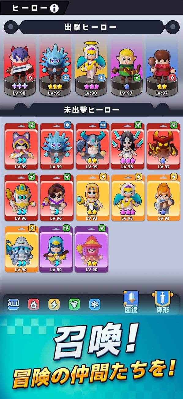 バトルはオートのため操作負担は最小限。いわゆるWAVE制となっており、一定の敵を倒すとまたワラワラと敵が湧いてきます。ただ眺めるだけでなく、どのヒーローがどれだけ活躍しているかの見極めが重要に。とはいえ、ヒーローが敵をなぎ倒す様を見るのも楽しみです。