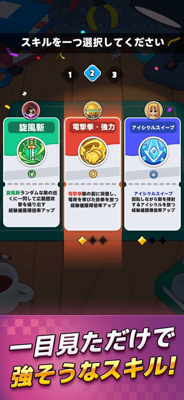 ステージ攻略中のレベルアップごとにヒーローのスキルを強化していきます。バトル中におけるプレイヤーの唯一と言ってもいい介入要素。ヒーローの活躍具合とランダムで表示されるスキルを吟味しながら最善の選択をひねり出す、そんな戦略性が備わっています。