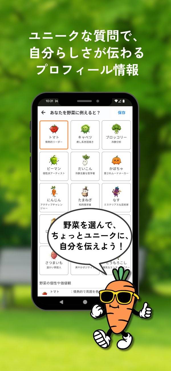 ほか「自分を野菜に例えると?」といったユニークな質問や写真の投稿などで価値観をアピール可能。表面的ではない、感性が響き合う深いつながりを見つけられます。