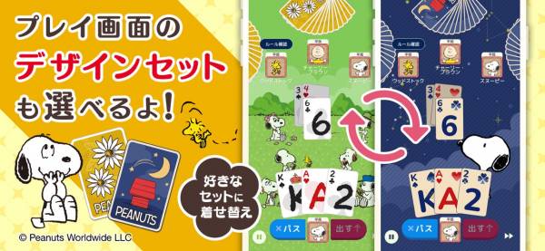 テーマの異なる2種類のトランプ絵柄が用意されており、いつでも変更可能です。一方は自然を感じる緑色が目に優しく、もう一方は星空がテーマのシックな雰囲気。もちろんどちらにもスヌーピーとウッドストックが登場しており、それぞれで違うテイストを味わえます。