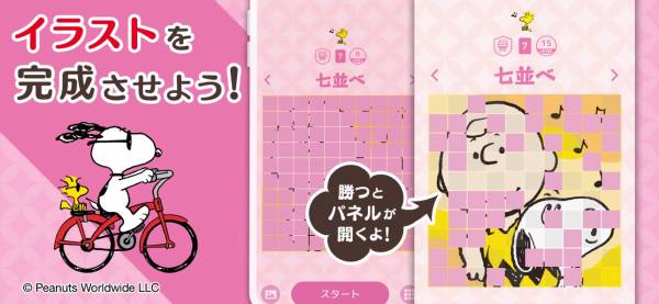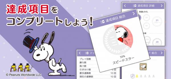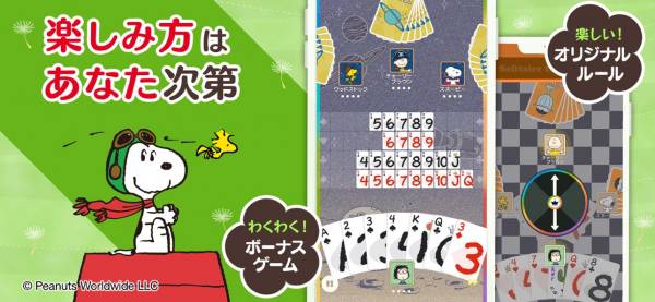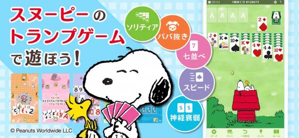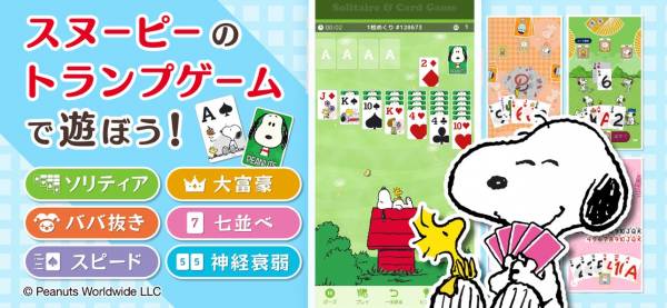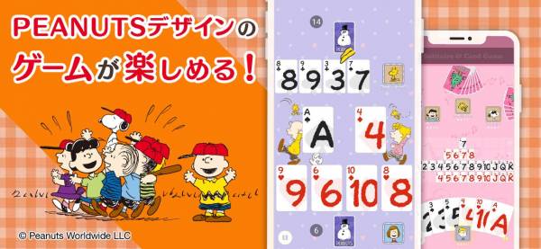 - ソリティアなど、5種類のゲームで遊べる。スヌーピーたちも参加