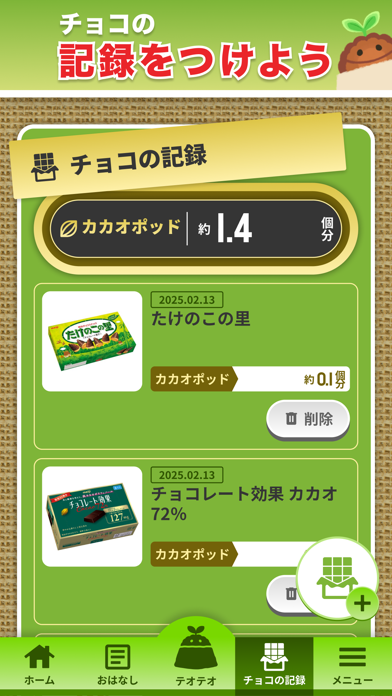 「今日のチョコガチャ」というガチャ機能を搭載。1日1回チャレンジすることができ、チョコベビーやきのこの山など、明治製品のチョコレートが実装されています。チョコレートのミニ解説もあるので、何のチョコレートを食べるか迷ったときに試してみては?