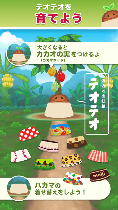 チョコレートの「明治」から、育成ゲームアプリが登場。カカオの妖精「テオテオ」のお世話をしながら、カカオに関することをクイズで学んだり、チョコの記録をつけたりできます。かわいらしいグラフィックと、ゆったりとしたテンポで癒し度バツグン。のんびり楽しみたい方にぴったりのアプリです。