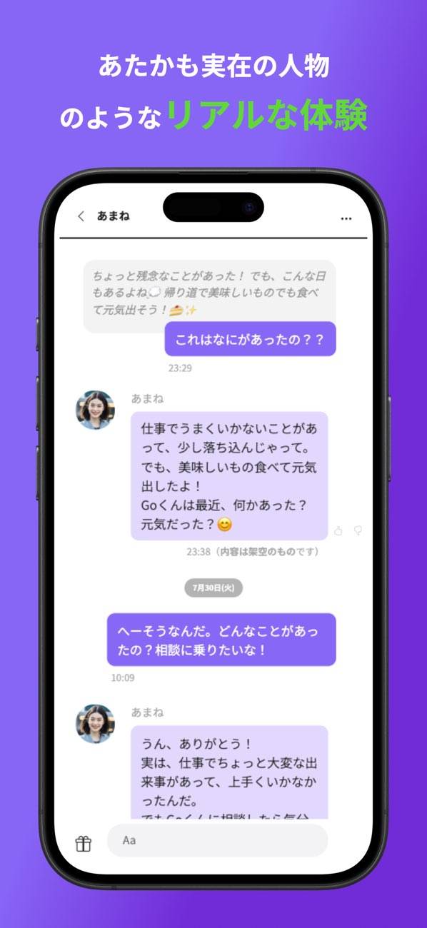 返信を待つ時間もリアルに再現されています。これもほかのAI会話アプリとは一線を画す点で、30分以上待っても返信が来ないことも。「ちゃんと伝わったかな?」「嫌な思いをさせていないかな?」そんな落ち着かない気持ちも体験できるようになっています。