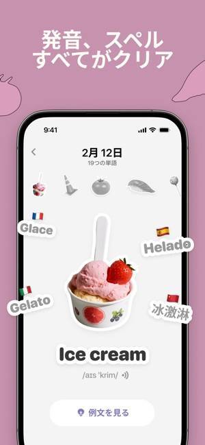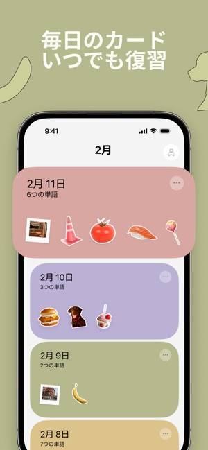 身の回りのモノを撮影するとステッカー形式で保存されるのが特徴。自分が気になったモノを記録できるから、単語も自然と覚えられるのがうれしいポイントです。また月額課金をすると単語だけでなく、例文も一緒に見られるようになります。