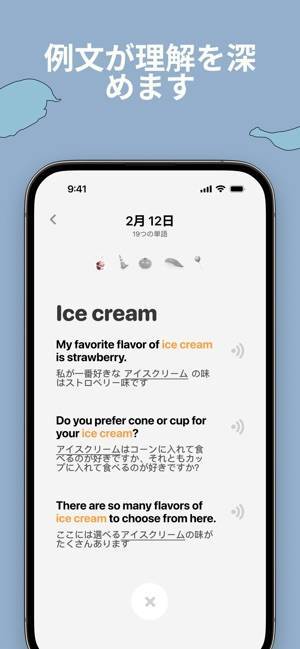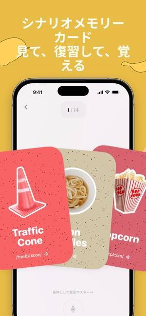 カードを左右にフリックすることで単語を振り分ける復習モードを搭載。左フリックで「わからない」右フリックで「わかる」と振り分けることで、次回復習時にはわからない単語だけが表示されるように。またマイクアイコンを長押しすれば、発音のチェックも可能です。