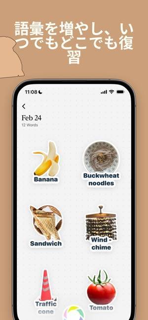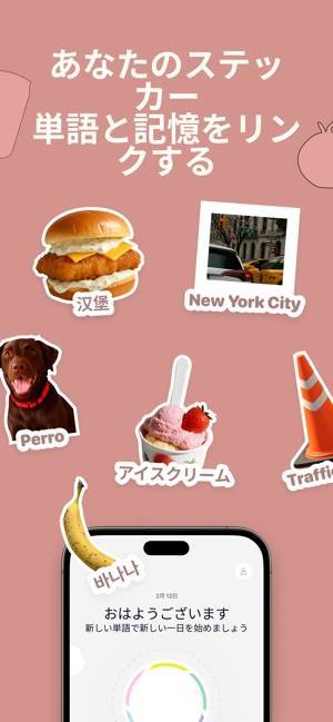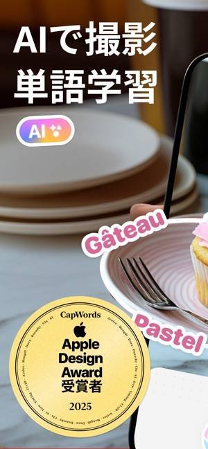 写真を撮るだけで看板や食べ物などを瞬時に認識し、10言語の単語に変換する学習アプリ。撮影したものはステッカーのようなデザインで登録されていくので、おしゃれを感じながら学んでいける仕組みになっています。