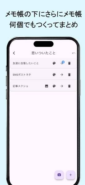シンプルで見やすく、メモ機能に特化しているのが特徴です。「+」をタップしてメモを作成するだけでいいから簡単。また好みに応じて、各メモの子階層にさらにメモ帳を作れます。すっきりとまとめられるのがうれしいポイント。