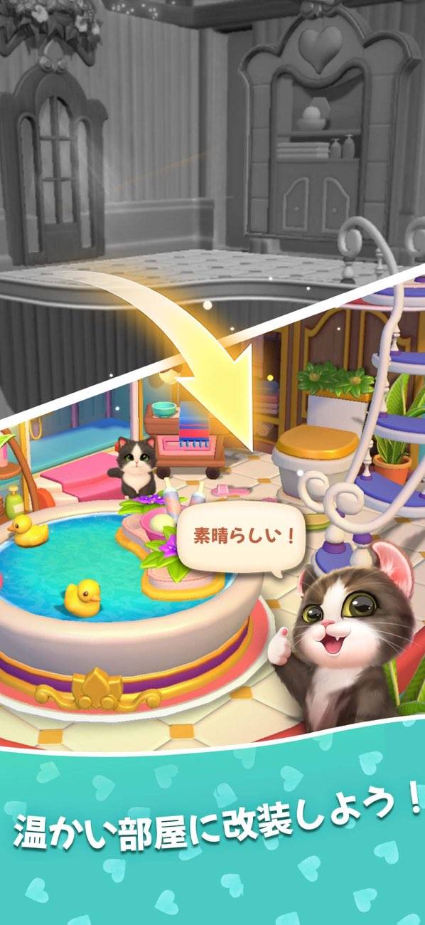 パズルをクリアするほどに、猫が救われていきます。ケガが治療され、住居も少しずつ温かみのあるものに建て直されていくのです。最初が不幸のどん底だったからこそ、幸せになっていく様子に感慨もひとしお。もっと構ってあげたい、そんな気持ちが湧いてきます。