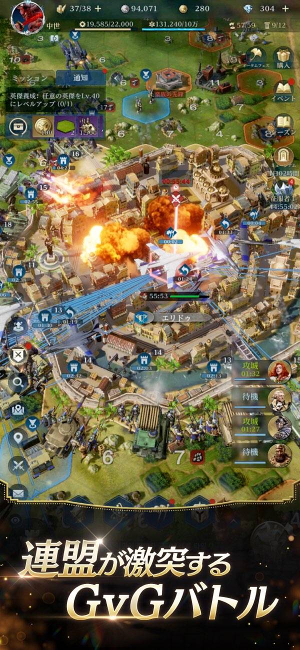 世界中のプレイヤーと同盟を結んで参加する大規模戦闘(GvG)も搭載。リアルタイムで敵要塞を攻撃・防衛する攻城戦では、仲間との連携が勝敗を分けます。画面上で繰り広げられる数百人規模の戦闘は迫力満点で、自分の戦略が歴史の流れを変える瞬間を実感できるでしょう。